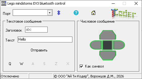 Предназначено для установки на компьютер/ноутбук. Интерфейс приложения состоит из двух основных блоков, каждый из которых отвечает за передачу определенного вида сообщений: числовых и текстовых. Блок «Числовое сообщение» имитирует нажатие кнопок на хабе Lego Mindstorms EV3. Кнопки блока связаны с клавишами стрелок (← ↑↓→) и клавишей «пробел» на клавиатуре.